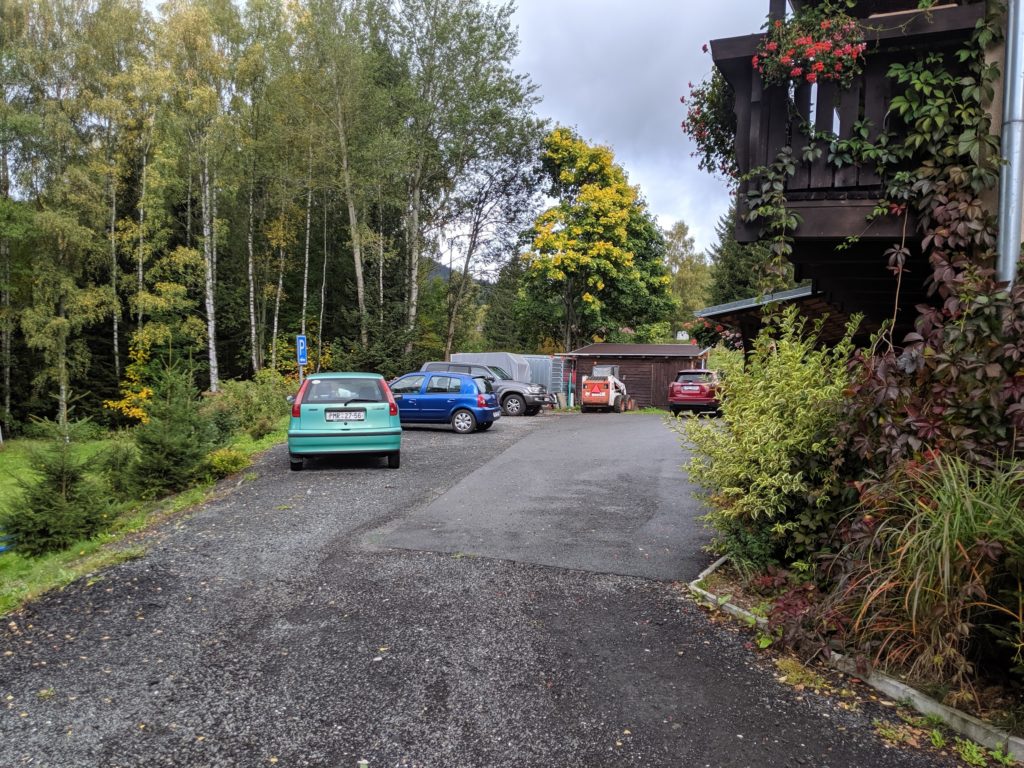 Níže je možné vidět parkoviště, kde jsme parkovali naše auto. Jde o soukromé parkoviště. Napravo je pak schované sezení, kde můžete posedět. Co jsme pochopili, tak penzion je oblíbený u motorkářů. Vaší motorku můžete schovat pod přístřeškem.